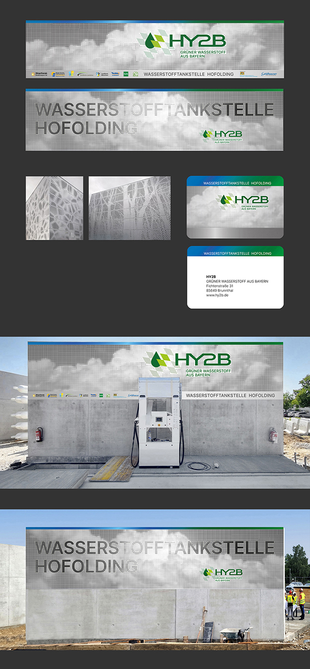 Grafisches Konzept für die Wasserstofftankstelle in Hofolding/ Brunnthal. Vorgesehen ist eine Aluminium-Perforierte-Panel-Fassade.